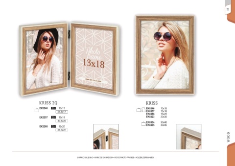 51 KRISS 2Q KRISS EK2246 2x 10x15 EK8346 10x15 24,5x17 EK8357 13x18 EK8368 15x20 EK2257 2x 13x18 EK8323 20x30 30,5x20 EK8334 30x40 EK2268 2x 15x20 EK8335 30x45 34,5x22 WOOD CORNICI IN LEGNO • MARCOS EN MADERA • WOOD PHOTO FRAMES • HOLZBILDERRAHMEN