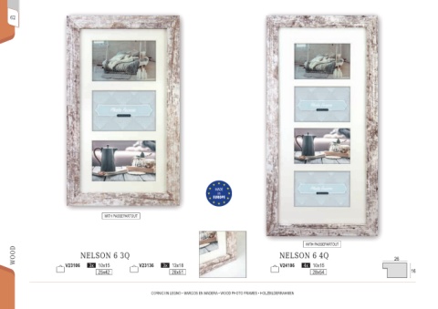 62 WITH PASSEPARTOUT WITH PASSEPARTOUT WOOD NELSON 6 3Q NELSON 6 4Q 26 V23106 3x 10x15 28x54 28x51 25x42 V23136 3x 13x18 V24106 4x 10x15 16 CORNICI IN LEGNO • MARCOS EN MADERA • WOOD PHOTO FRAMES • HOLZBILDERRAHMEN
