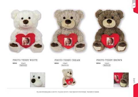 181 PHOTO TEDDY WHITE PHOTO TEDDY CREAM PHOTO TEDDY BROWN DD532 3,5x4,5 DD533 3,5x4,5 DD534 3,5x4,5 16x13 h 23 16x13 h 23 16x13 h 23 LOVE PELUCHE PERSONALIZZABILE CON FOTO • PELUCHE CON FOTO • TEDDY BEAR WITH PHOTOFRAME • TEDDYBÄR MIT RAHMEN