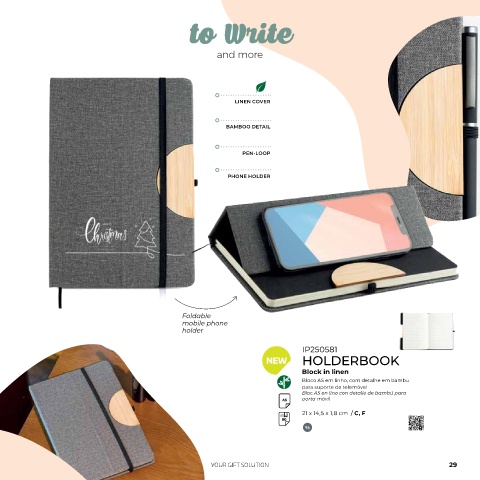 Bloco A5 em linho, com detalhe em bambu