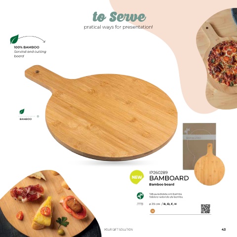 to Serve pratical ways for presentation! 100% BAMBOO Servind and cutting board BAMBOO IP260289 NEW BAMBOARD Bamboo board Tábua redonda em bambu Tablero redondo de bambú ø 29 cm / B, D, F, H 38 YOUR GIFT SOLUTION 43