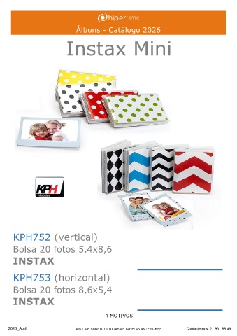 Álbuns - Catálogo 2026 Instax Mini KPH752 (vertical) Bolsa 20 fotos 5,4x8,6 INSTAX ______ KPH753 (horizontal) Bolsa 20 fotos 8,6x5,4 INSTAX ______ 4 MOTIVOS 2026_Abril ANULA E SUBSTITUI TODAS AS TABELAS ANTERIORES Contacte-nos: 21 931 88 49