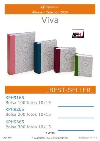 Álbuns - Catálogo 2026 Viva _BEST-SELLER_ KPH9165 Bolsa 100 fotos 10x15 ______ KPH9265 Bolsa 200 fotos 10x15 ______ KPH9365 Bolsa 300 fotos 10x15 ______ 4 CORES 2026_Abril ANULA E SUBSTITUI TODAS AS TABELAS ANTERIORES Contacte-nos: 21 931 88 49