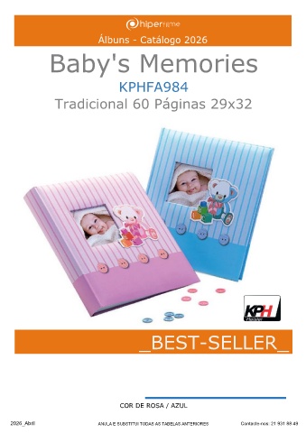 Álbuns - Catálogo 2026 Baby's Memories KPHFA984 Tradicional 60 Páginas 29x32 _BEST-SELLER_ ______ COR DE ROSA / AZUL 2026_Abril ANULA E SUBSTITUI TODAS AS TABELAS ANTERIORES Contacte-nos: 21 931 88 49