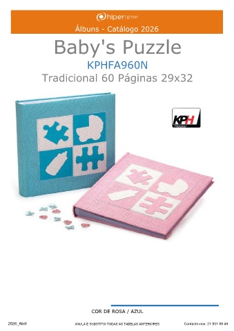 Álbuns - Catálogo 2026 Baby's Puzzle KPHFA960N Tradicional 60 Páginas 29x32 ______ COR DE ROSA / AZUL 2026_Abril ANULA E SUBSTITUI TODAS AS TABELAS ANTERIORES Contacte-nos: 21 931 88 49