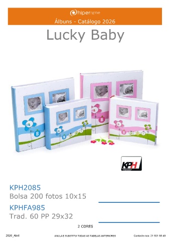 Álbuns - Catálogo 2026 Lucky Baby KPH2085 Bolsa 200 fotos 10x15 ______ KPHFA985 Trad. 60 PP 29x32 ______ 2 CORES 2026_Abril ANULA E SUBSTITUI TODAS AS TABELAS ANTERIORES Contacte-nos: 21 931 88 49