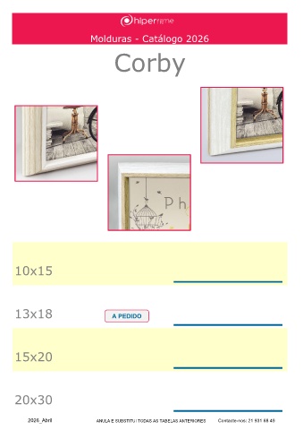 Molduras - Catálogo 2026 Lugo Corby ______ 10x15 ______ 13x18 A PEDIDO ______ 15x20 ______ 20x30 2026_Abril ANULA E SUBSTITUI TODAS AS TABELAS ANTERIORES Contacte-nos: 21 931 88 49