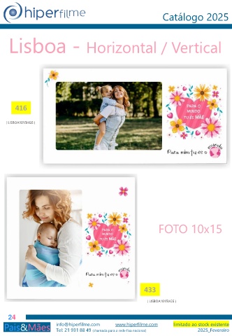 Catálogo 2025 Lisboa - Horizontal / Vertical 416 ( LISBOA1015HGS ) FOTO 10x15 433 ( LISBOA1015VGS ) 24 info@hiperfilme.com www.hiperfilme.com limitado ao stock existente Tel: 21 931 88 49 (chamada para a rede fixa nacional) 2025_Fevereiro