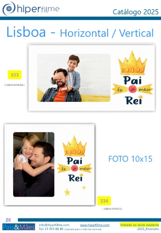 Catálogo 2025 Lisboa - Horizontal / Vertical 333 ( LISBOA1015HGS ) FOTO 10x15 334 ( LISBOA1015VGS ) 26 info@hiperfilme.com www.hiperfilme.com limitado ao stock existente Tel: 21 931 88 49 (chamada para a rede fixa nacional) 2025_Fevereiro